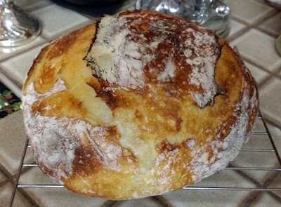 Warm water in microwave for 1 minute on high. Weigh flour and place in large bowl. Mix starter and 350 mls water thoroughly in another bowl. Pour mixture over flour and mix until all flour is folded in. Let dough rest for 30 minutes. Work salt and remaining water into the dough by squeezing and mixing by hand. Transfer to a smaller container, cover, and let sit for 30 minutes. Turn the dough by stretching and folding over 3 or 4 times. Repeat every 30 min for 3 more turns (book recommends 5 more, but 3 is usually enough). Let dough rise for around 4 hours.