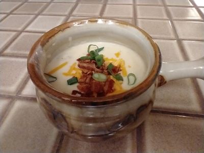 Prep time: 20 minutes Cook time: 20 minutes Combine potatoes and stock in a medium sauce-pan. Bring to a boil; reduce heat and simmer, covered, for about 10 minutes or until potatoes are tender. Let cool slightly, then transfer potatoes and stock to a blender or food processor. Blend until fairly smooth with some small chunks of potatoes remaining. Return mixture to saucepan and heat until boiling. Remove from heat and stir in half-and-half, sour cream, cheese, green onions, bacon, garlic, salt, and pepper. Cook over low heat for 5 minutes more. Spoon into bowls and top with garnishes (additional bacon, green onions, cheese) as desired. Makes 4 servings.